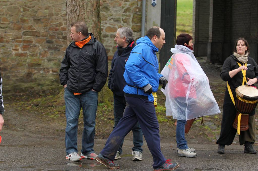 Derrière moi, mes deux accompagnateurs m’ont laissé un peu d’air. Ils discutent avec les signaleurs et « débalisent » le parcours. Malgré cela, ils me rejoignent avec une aisance déconcertante. Le troisième château approche. « Cela va bientôt descendre, Monsieur ! ». Ils sont sympas et prévenants. Mais cela ne diminue pas la difficulté. Les chemins de terre et la prairie ne forment plus d’un océan de boue. Sortie du parc. Les joueurs de tam-tam me tournent le dos. Ils préfèrent jouer pour les participants de l’autre course qui reviennent déjà en face après une boucle supplémentaire de 7 kilomètres. Dans la descente, ils me dépassent à fond de balle mais, comme je suis « gros », je résiste à la traînée d’aspiration. L’un d’eux m’adresse un petit coup de coude au passage. Je doute que cela soit un signe d’encouragement. A l’entrée de la Basse-Ruelle, c’est le dernier ravitaillement péket. En vrai sportif, je refuse. « Vous avez tord, cela fait descendre plus vite ! », m’adresse le préposé qui, lui aussi, a donc pris conscience du niveau de ma lenteur.